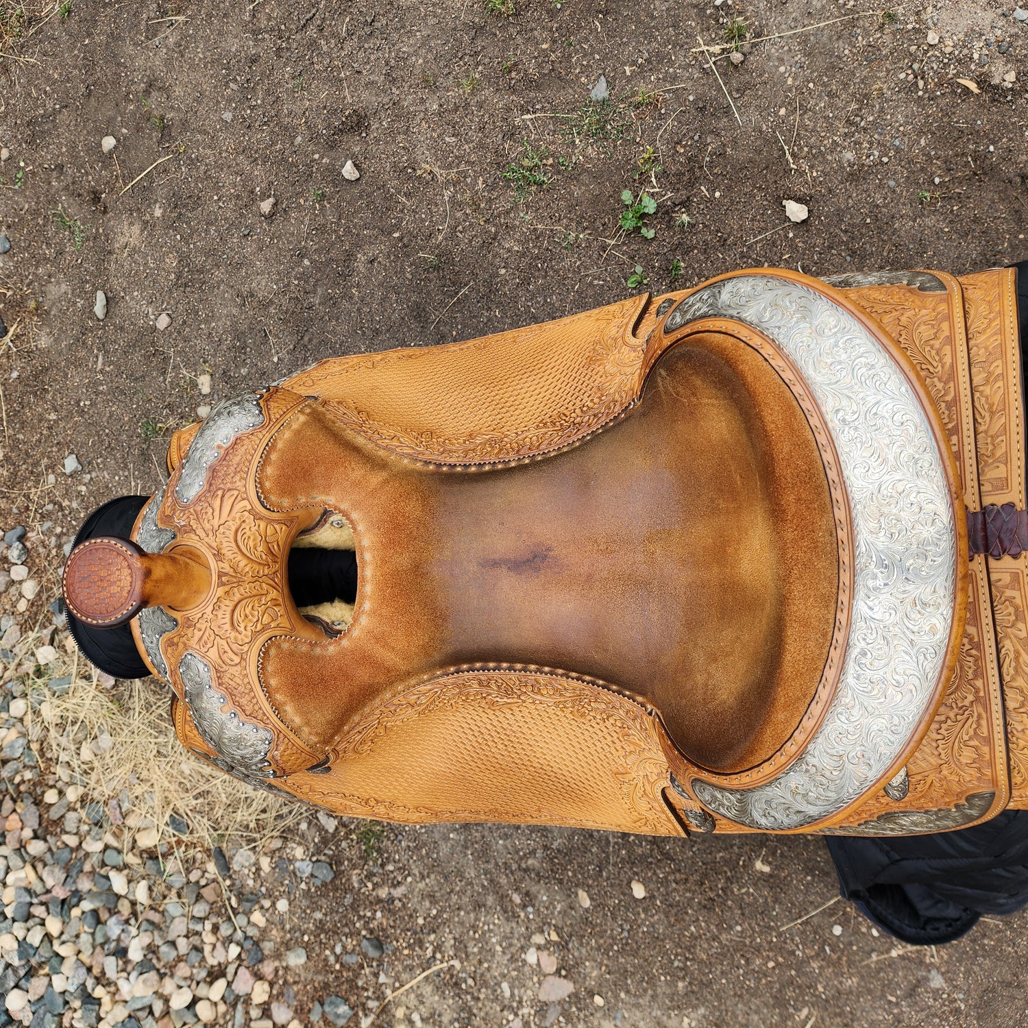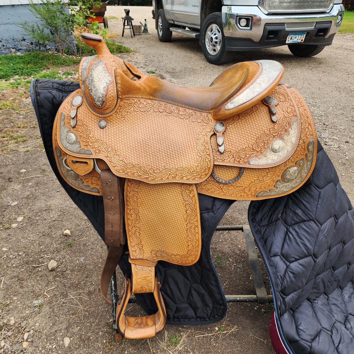 Blue Ribbon show saddle. 16" but padded to 15". I believe its a semi QH bar but measurements in photo. Very immaculate saddle and well cared for. $4500 + shipping