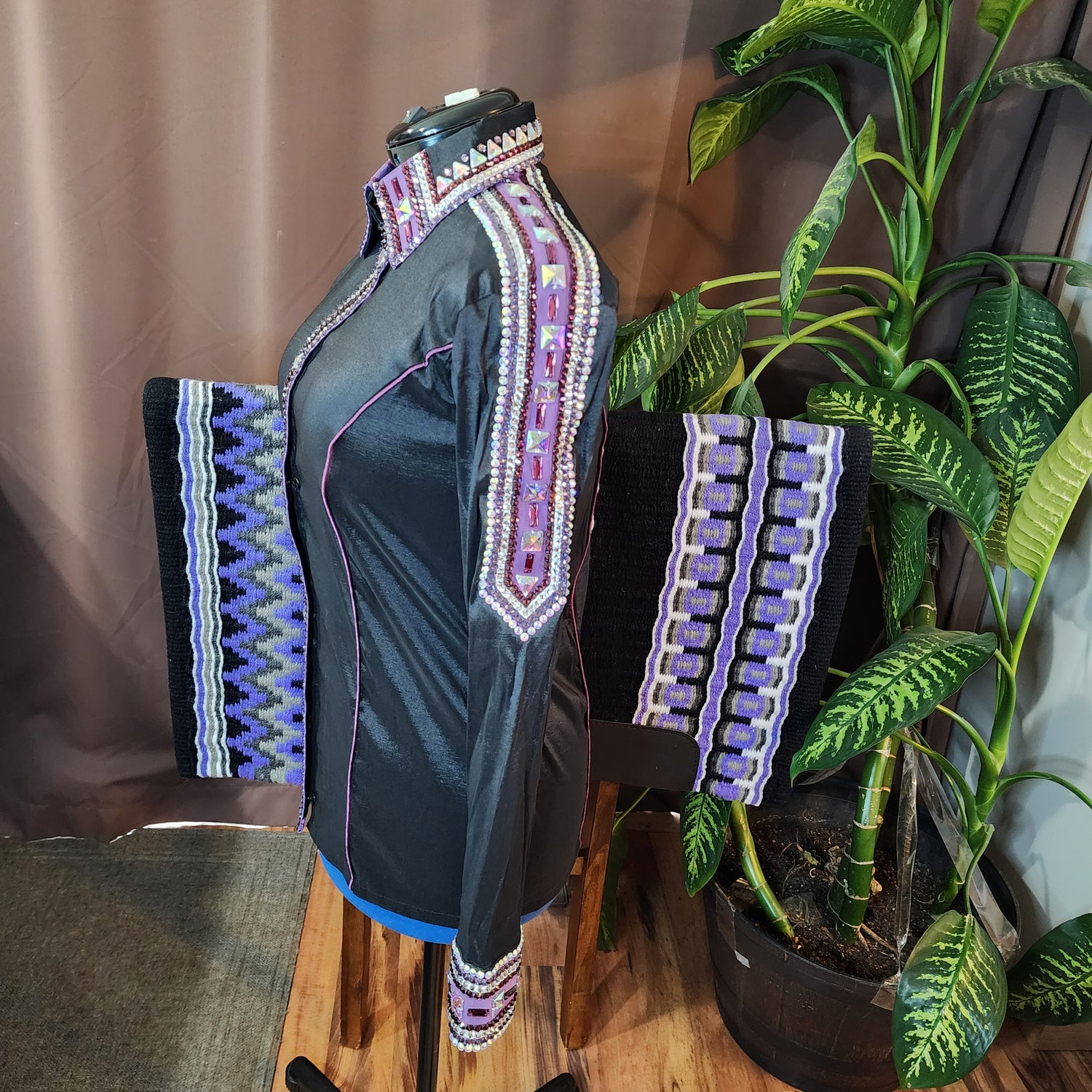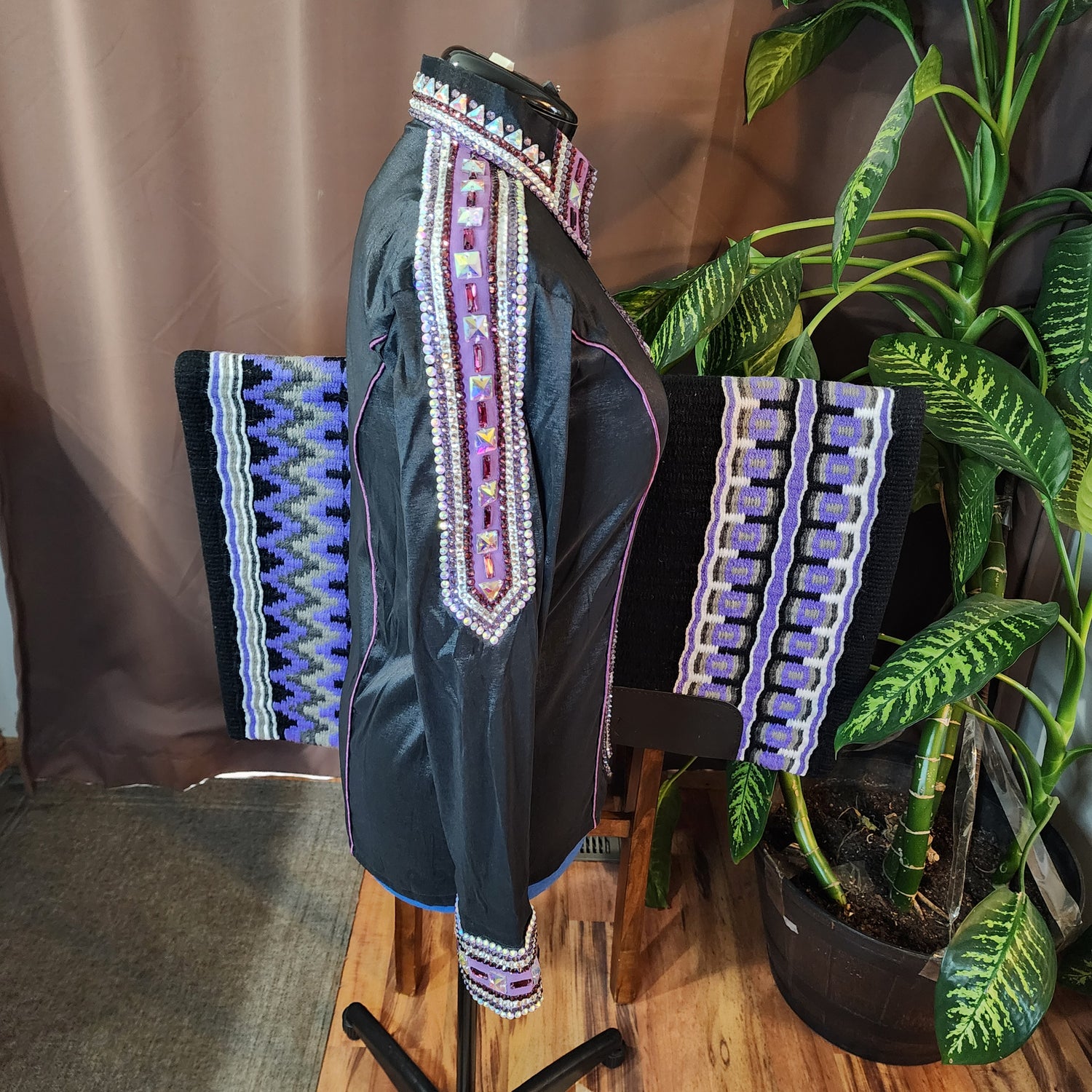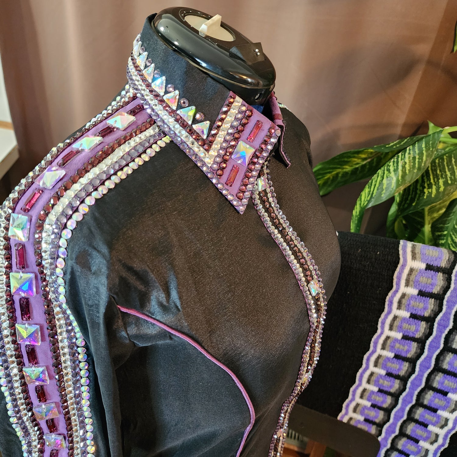 Large Black stretch taffeta day shirt with purple & lavender crystals. $500