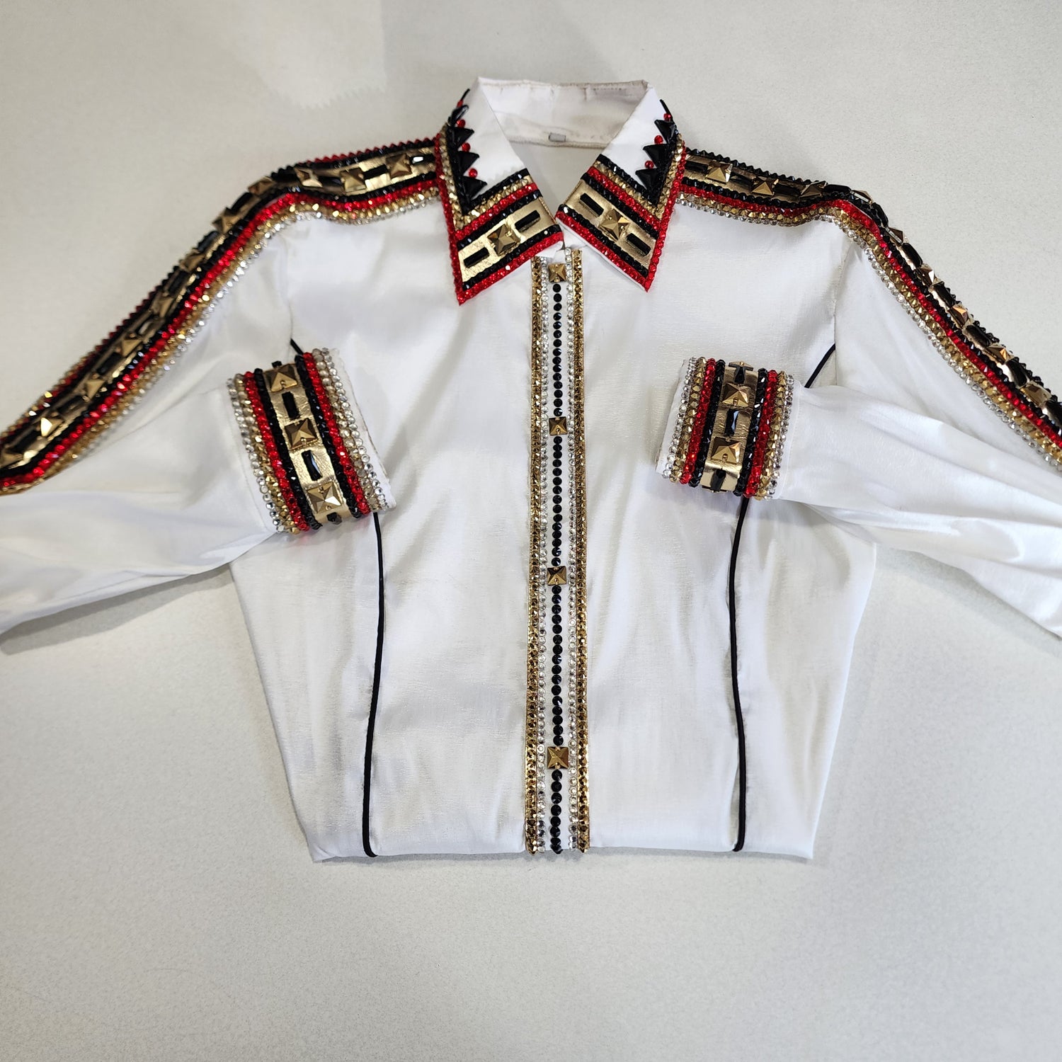 Large white stretch taffeta hidden zipper day shirt. Lots of stretch. Red, gold, black & clear crystals. Black front & back piping. This shirt has been gently worn. $400