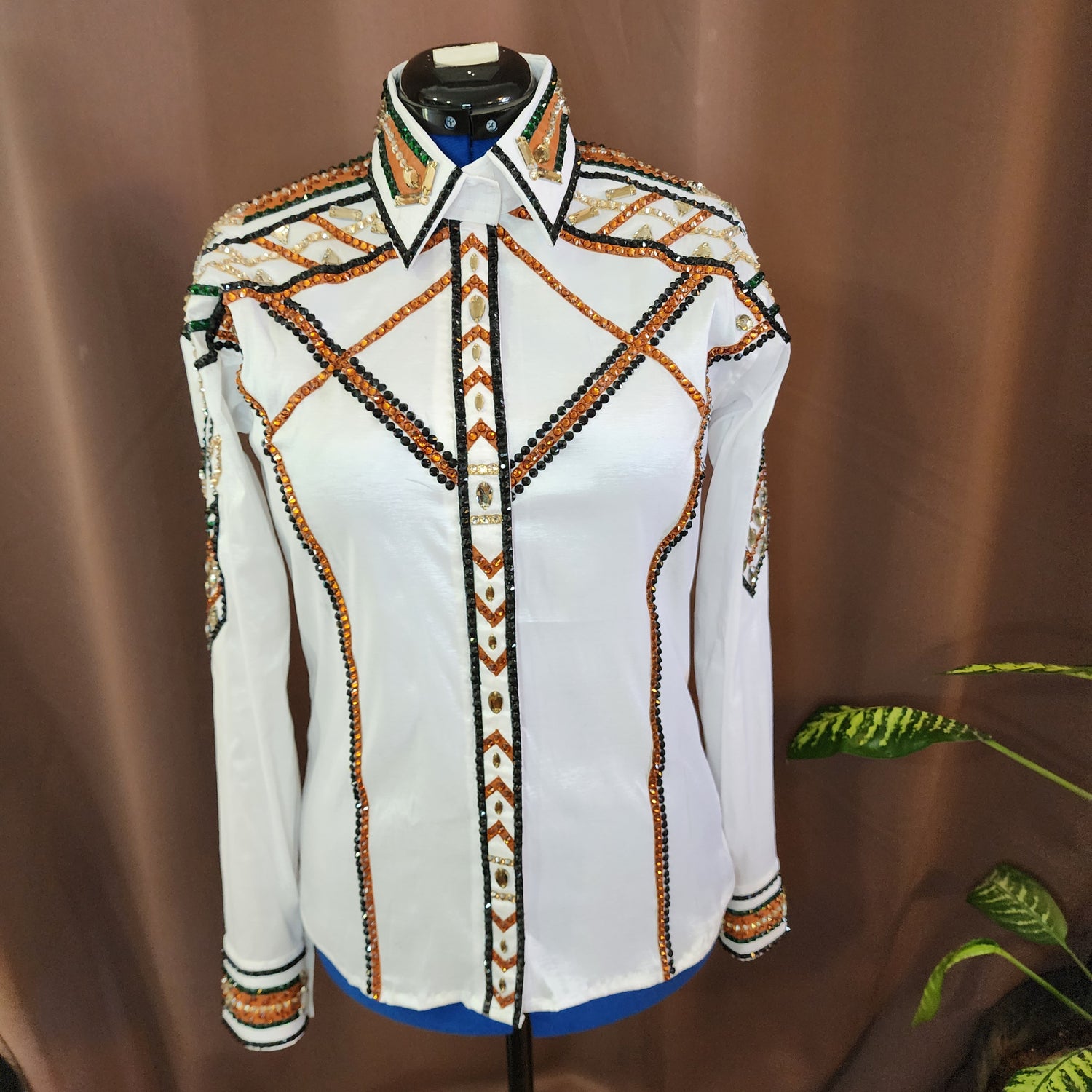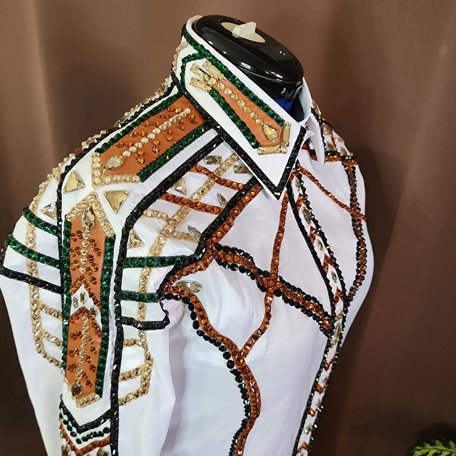 Large white stretch taffeta loaded with tan, black, and green crystals. $550