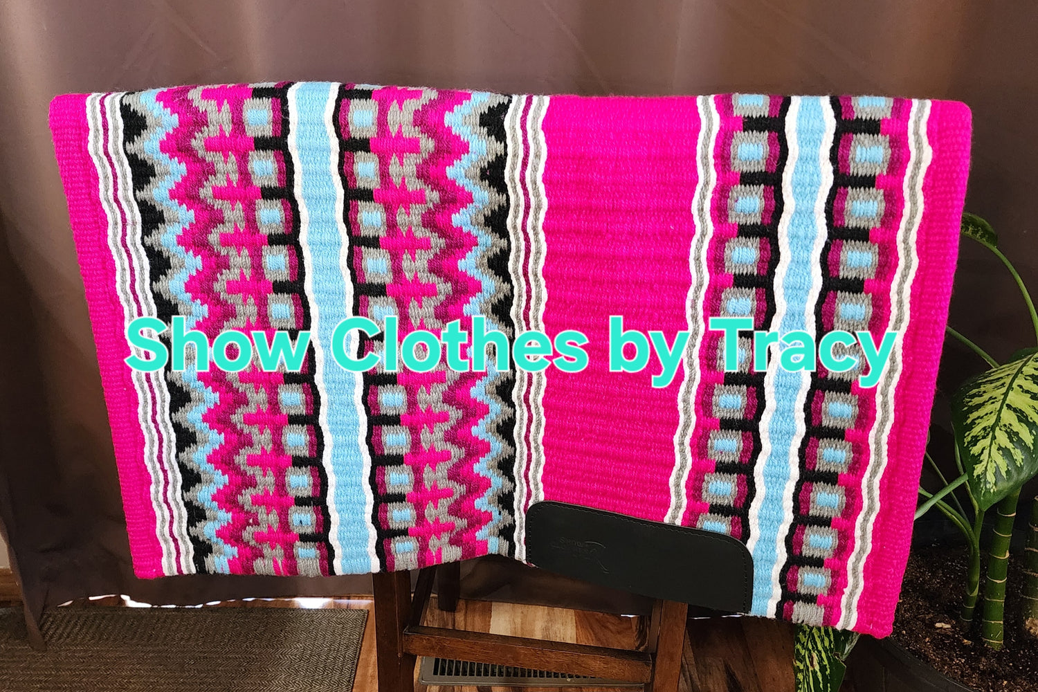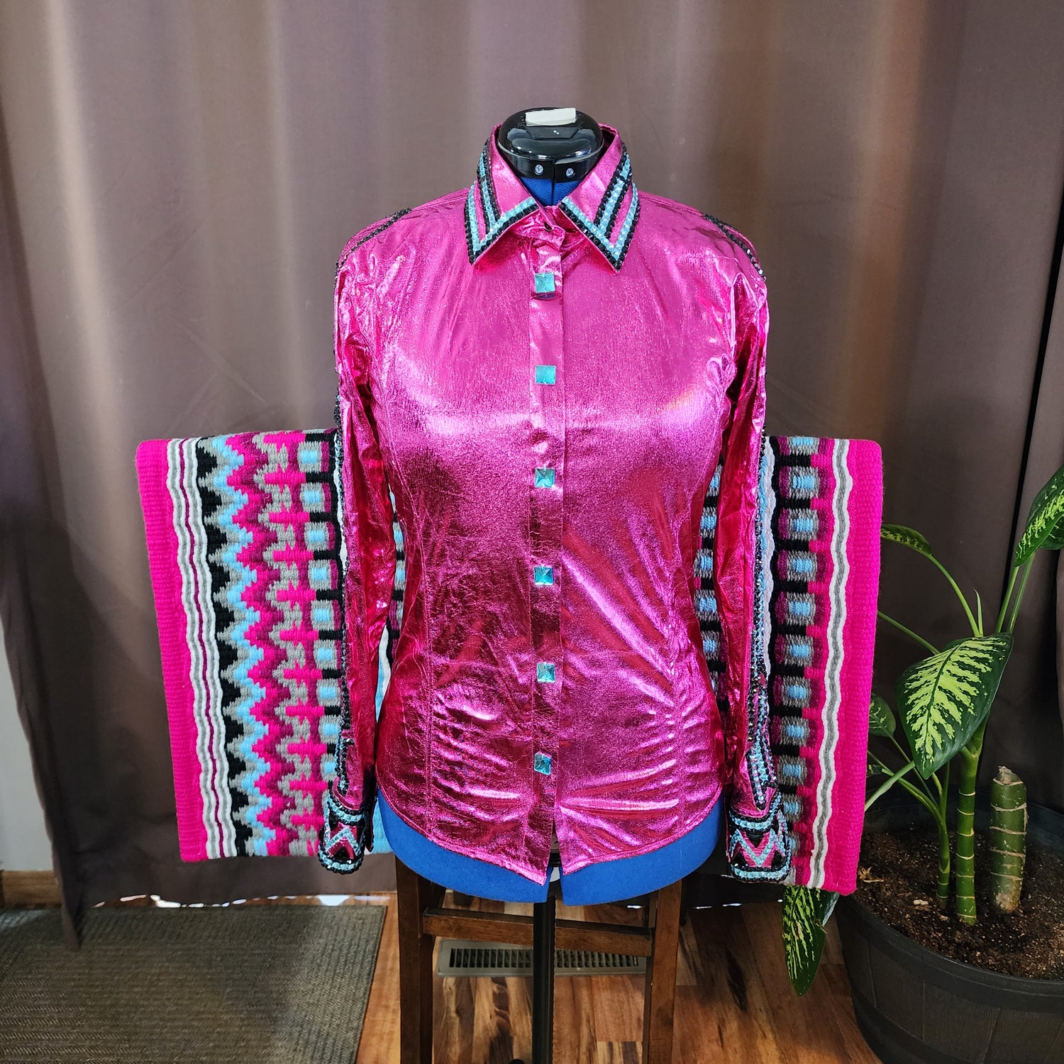 Medium Metallic Fuchsia stretch day shirt. Lots of stretch, lightweight, & cool fabric. Turquoise & black crystals. $350