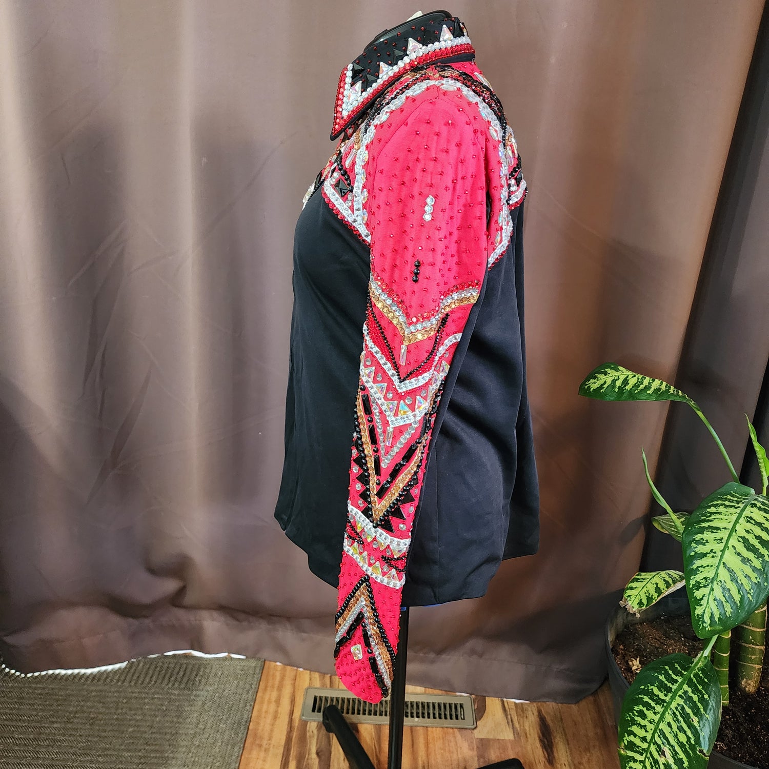 Plus size black stretch base front zip show jacket. $175